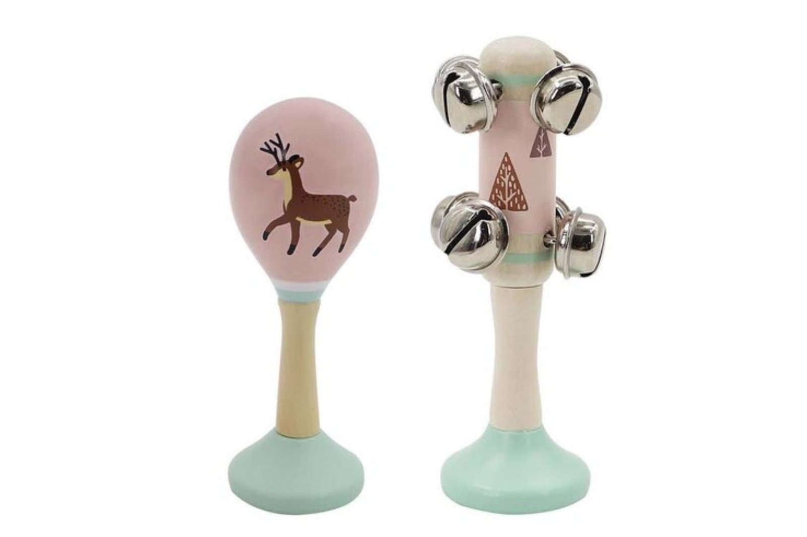 This beautifully finished 2 piece wooden musical set in woodland Deer themed designs. Each 2 piece set consists of a maraca and a bell stick and comes packaged together in a gift box.
