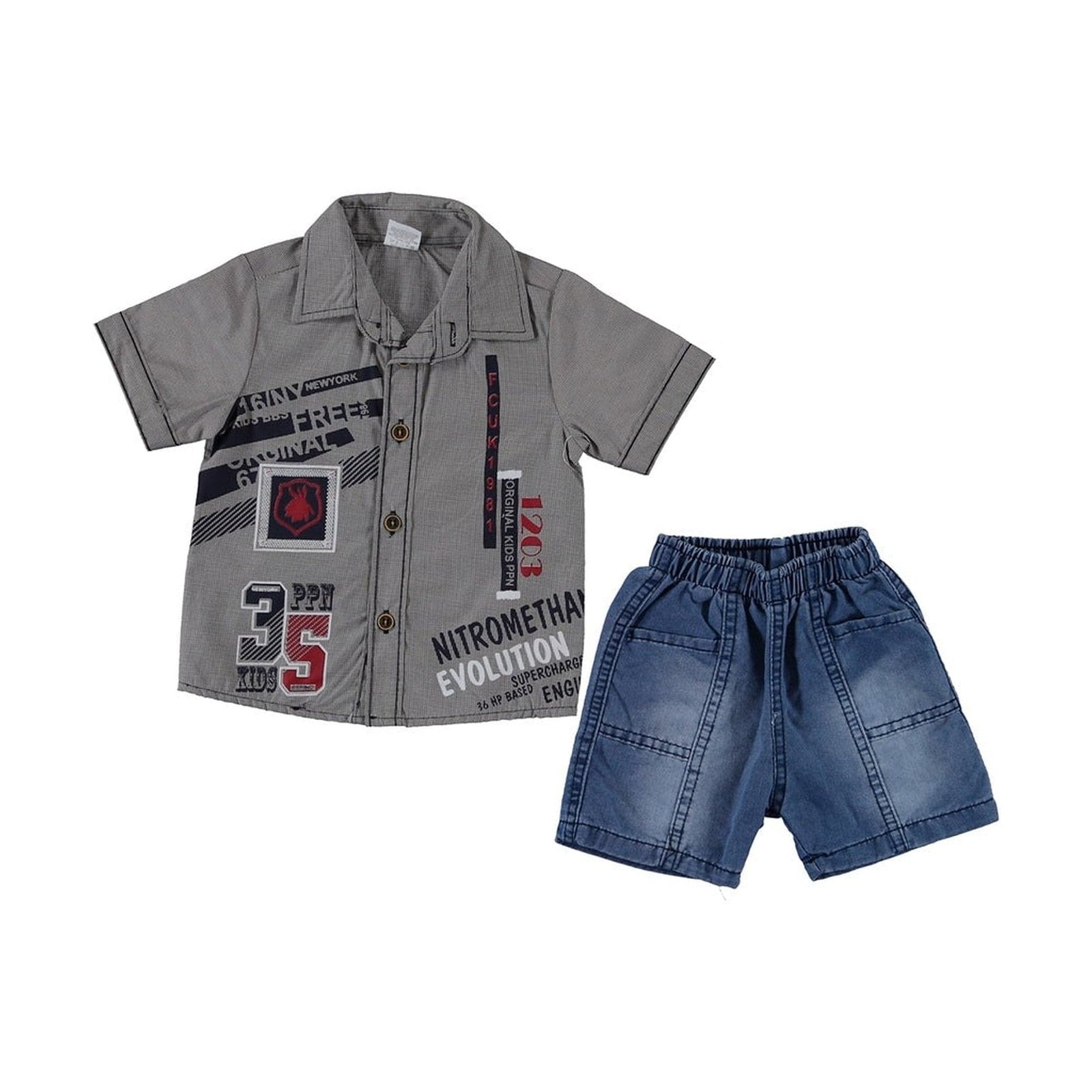 This stylish toddler boys’ outfit is perfect for a day of fun in the sun. The button-up shirt features a stylish number logo, and the denim shorts are comfortable and breathable.